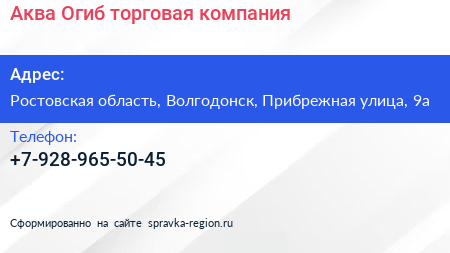 Аква-Огиб, торговая компания по адресу Ростовская область, Волгодонск, Прибрежная улица, 9а в дальнейшем Организация, размещена в следующих категориях: