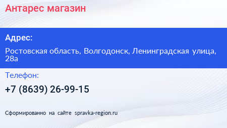 Антарес, магазин по адресу Ростовская область, Волгодонск, Ленинградская улица, 28а в дальнейшем Организация, размещена в следующих категориях: