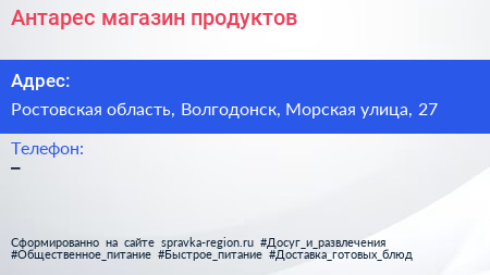Антарес, магазин продуктов по адресу Ростовская область, Волгодонск, Морская улица, 27 в дальнейшем Организация, размещена в следующих категориях: