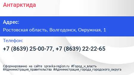 Антарктида по адресу Ростовская область, Волгодонск, Окружная, 1 в дальнейшем Организация, размещена в следующих категориях: