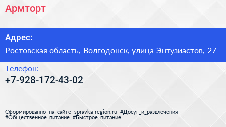 Армторт по адресу Ростовская область, Волгодонск, улица Энтузиастов, 27 в дальнейшем Организация, размещена в следующих категориях: