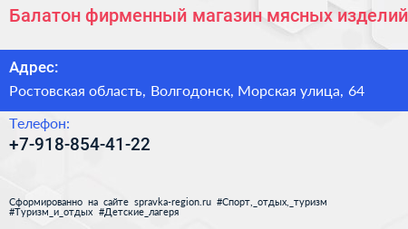 Балатон, фирменный магазин мясных изделий по адресу Ростовская область, Волгодонск, Морская улица, 64 в дальнейшем Организация, размещена в следующих категориях:
