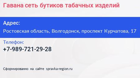 Гавана, сеть бутиков табачных изделий по адресу Ростовская область, Волгодонск, проспект Курчатова, 17 в дальнейшем Организация, размещена в следующих категориях: