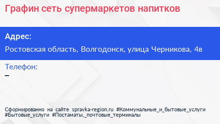 Графин, сеть супермаркетов напитков по адресу Ростовская область, Волгодонск, улица Черникова, 4в в дальнейшем Организация, размещена в следующих категориях: