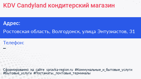 KDV Candyland, кондитерский магазин по адресу Ростовская область, Волгодонск, улица Энтузиастов, 31 в дальнейшем Организация, размещена в следующих категориях:
