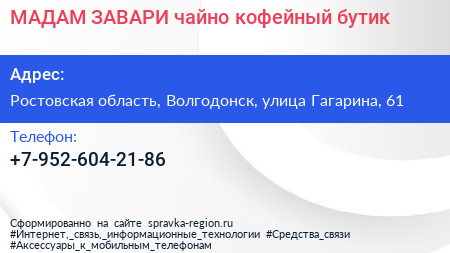 МАДАМ ЗАВАРИ, чайно-кофейный бутик по адресу Ростовская область, Волгодонск, улица Гагарина, 61 в дальнейшем Организация, размещена в следующих категориях: