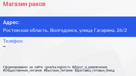 Магазин раков по адресу Ростовская область, Волгодонск, улица Гагарина, 26/2 в дальнейшем Организация, размещена в следующих категориях: