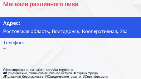 Магазин разливного пива по адресу Ростовская область, Волгодонск, Кооперативная, 26а в дальнейшем Организация, размещена в следующих категориях: