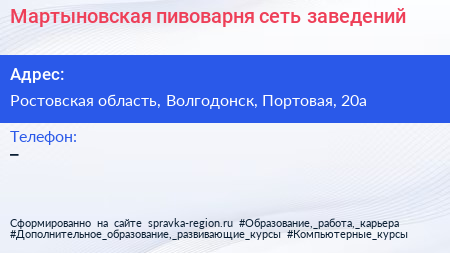 Мартыновская пивоварня, сеть заведений по адресу Ростовская область, Волгодонск, Портовая, 20а в дальнейшем Организация, размещена в следующих категориях: