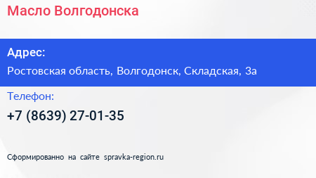 Масло Волгодонска по адресу Ростовская область, Волгодонск, Складская, 3а в дальнейшем Организация, размещена в следующих категориях: