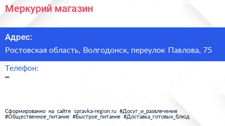Меркурий, магазин по адресу Ростовская область, Волгодонск, переулок Павлова, 75 в дальнейшем Организация, размещена в следующих категориях: