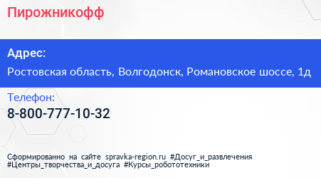 Пирожникофф по адресу Ростовская область, Волгодонск, Романовское шоссе, 1д в дальнейшем Организация, размещена в следующих категориях: