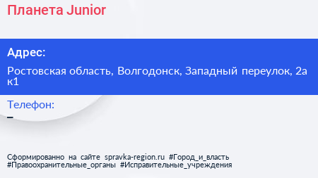 Планета Junior по адресу Ростовская область, Волгодонск, Западный переулок, 2а к1 в дальнейшем Организация, размещена в следующих категориях: