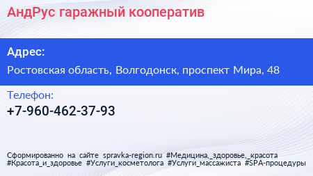 АндРус, гаражный кооператив по адресу Ростовская область, Волгодонск, проспект Мира, 48 в дальнейшем Организация, размещена в следующих категориях: