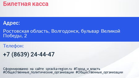 Билетная касса по адресу Ростовская область, Волгодонск, бульвар Великой Победы, 2 в дальнейшем Организация, размещена в следующих категориях: