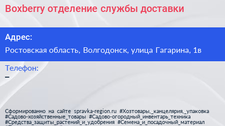 Boxberry, отделение службы доставки по адресу Ростовская область, Волгодонск, улица Гагарина, 1в в дальнейшем Организация, размещена в следующих категориях:
