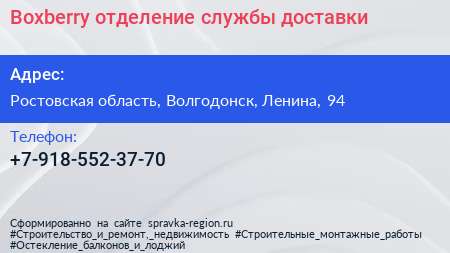 Boxberry, отделение службы доставки по адресу Ростовская область, Волгодонск, Ленина, 94 в дальнейшем Организация, размещена в следующих категориях: