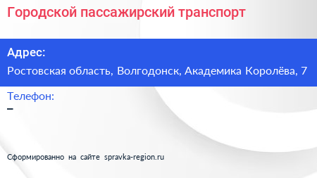 Городской пассажирский транспорт по адресу Ростовская область, Волгодонск, Академика Королёва, 7 в дальнейшем Организация, размещена в следующих категориях: