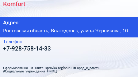 Komfort+ по адресу Ростовская область, Волгодонск, улица Черникова, 10 в дальнейшем Организация, размещена в следующих категориях: