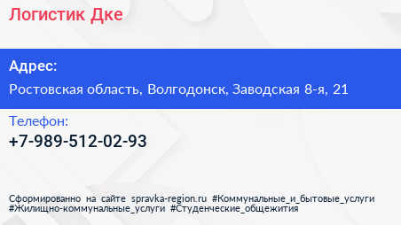 Логистик Дке по адресу Ростовская область, Волгодонск, Заводская 8-я, 21 в дальнейшем Организация, размещена в следующих категориях: