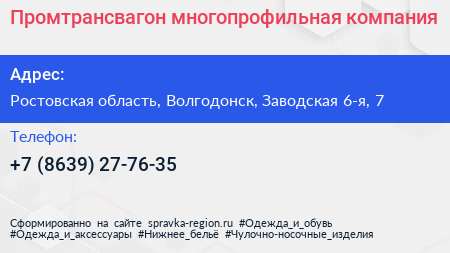 Промтрансвагон, многопрофильная компания по адресу Ростовская область, Волгодонск, Заводская 6-я, 7 в дальнейшем Организация, размещена в следующих категориях: