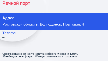 Речной порт по адресу Ростовская область, Волгодонск, Портовая, 4 в дальнейшем Организация, размещена в следующих категориях: