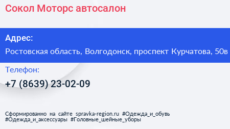 Сокол Моторс, автосалон по адресу Ростовская область, Волгодонск, проспект Курчатова, 50в в дальнейшем Организация, размещена в следующих категориях: