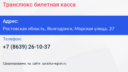 Транслюкс, билетная касса по адресу Ростовская область, Волгодонск, Морская улица, 27 в дальнейшем Организация, размещена в следующих категориях: