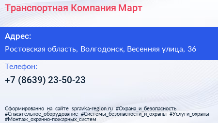 Транспортная Компания Март по адресу Ростовская область, Волгодонск, Весенняя улица, 36 в дальнейшем Организация, размещена в следующих категориях: