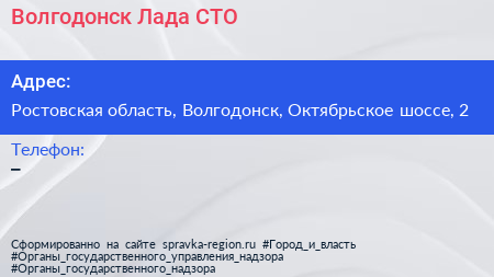 Волгодонск Лада, СТО по адресу Ростовская область, Волгодонск, Октябрьское шоссе, 2 в дальнейшем Организация, размещена в следующих категориях: