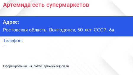 Артемида, сеть супермаркетов по адресу Ростовская область, Волгодонск, 50 лет СССР, 6а в дальнейшем Организация, размещена в следующих категориях: