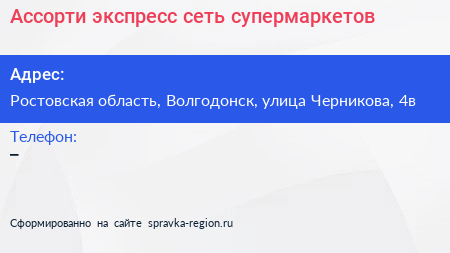 Ассорти-экспресс, сеть супермаркетов по адресу Ростовская область, Волгодонск, улица Черникова, 4в в дальнейшем Организация, размещена в следующих категориях: