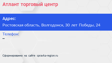 Атлант, торговый центр по адресу Ростовская область, Волгодонск, 30 лет Победы, 24 в дальнейшем Организация, размещена в следующих категориях: