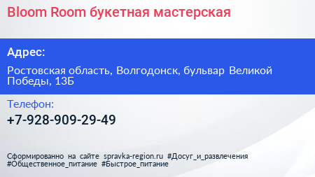 Bloom Room, букетная мастерская по адресу Ростовская область, Волгодонск, бульвар Великой Победы, 13Б в дальнейшем Организация, размещена в следующих категориях: