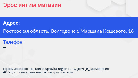 Эрос, интим-магазин по адресу Ростовская область, Волгодонск, Маршала Кошевого, 18 в дальнейшем Организация, размещена в следующих категориях: