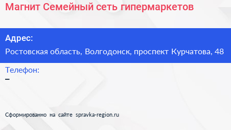 Магнит Семейный, сеть гипермаркетов по адресу Ростовская область, Волгодонск, проспект Курчатова, 48 в дальнейшем Организация, размещена в следующих категориях: