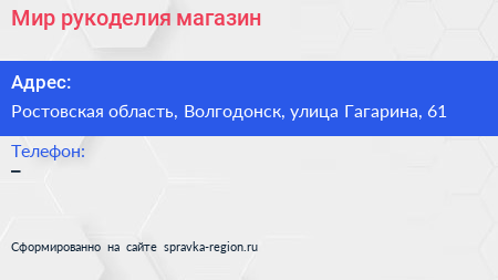 Мир рукоделия, магазин по адресу Ростовская область, Волгодонск, улица Гагарина, 61 в дальнейшем Организация, размещена в следующих категориях: