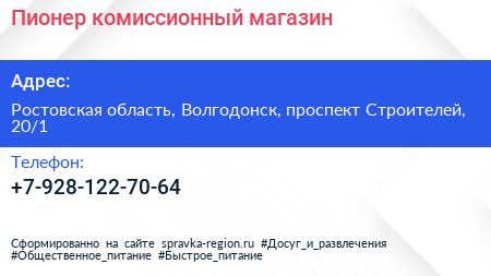 Пионер, комиссионный магазин по адресу Ростовская область, Волгодонск, проспект Строителей, 20/1 в дальнейшем Организация, размещена в следующих категориях: