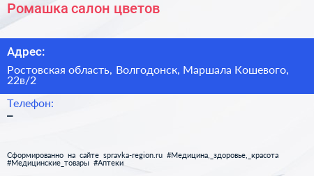 Ромашка, салон цветов по адресу Ростовская область, Волгодонск, Маршала Кошевого, 22в/2 в дальнейшем Организация, размещена в следующих категориях: