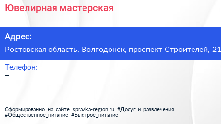 Ювелирная мастерская по адресу Ростовская область, Волгодонск, проспект Строителей, 21 в дальнейшем Организация, размещена в следующих категориях: