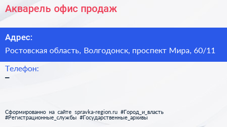Акварель, офис продаж по адресу Ростовская область, Волгодонск, проспект Мира, 60/11 в дальнейшем Организация, размещена в следующих категориях: