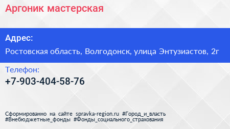Аргоник, мастерская по адресу Ростовская область, Волгодонск, улица Энтузиастов, 2г в дальнейшем Организация, размещена в следующих категориях: