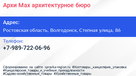 Архи-Мах, архитектурное бюро по адресу Ростовская область, Волгодонск, Степная улица, 86 в дальнейшем Организация, размещена в следующих категориях: