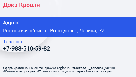 Дока Кровля по адресу Ростовская область, Волгодонск, Ленина, 77 в дальнейшем Организация, размещена в следующих категориях: