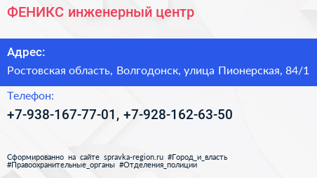 ФЕНИКС, инженерный центр по адресу Ростовская область, Волгодонск, улица Пионерская, 84/1 в дальнейшем Организация, размещена в следующих категориях: