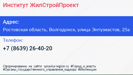 Институт ЖилСтройПроект по адресу Ростовская область, Волгодонск, улица Энтузиастов, 25а в дальнейшем Организация, размещена в следующих категориях: