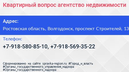 Квартирный вопрос, агентство недвижимости по адресу Ростовская область, Волгодонск, проспект Строителей, 13 в дальнейшем Организация, размещена в следующих категориях: