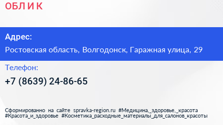 ОБЛ И К по адресу Ростовская область, Волгодонск, Гаражная улица, 29 в дальнейшем Организация, размещена в следующих категориях:
