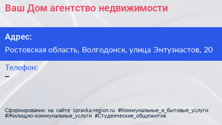 Ваш Дом, агентство недвижимости по адресу Ростовская область, Волгодонск, улица Энтузиастов, 20 в дальнейшем Организация, размещена в следующих категориях: