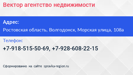 Вектор, агентство недвижимости по адресу Ростовская область, Волгодонск, Морская улица, 108а в дальнейшем Организация, размещена в следующих категориях: